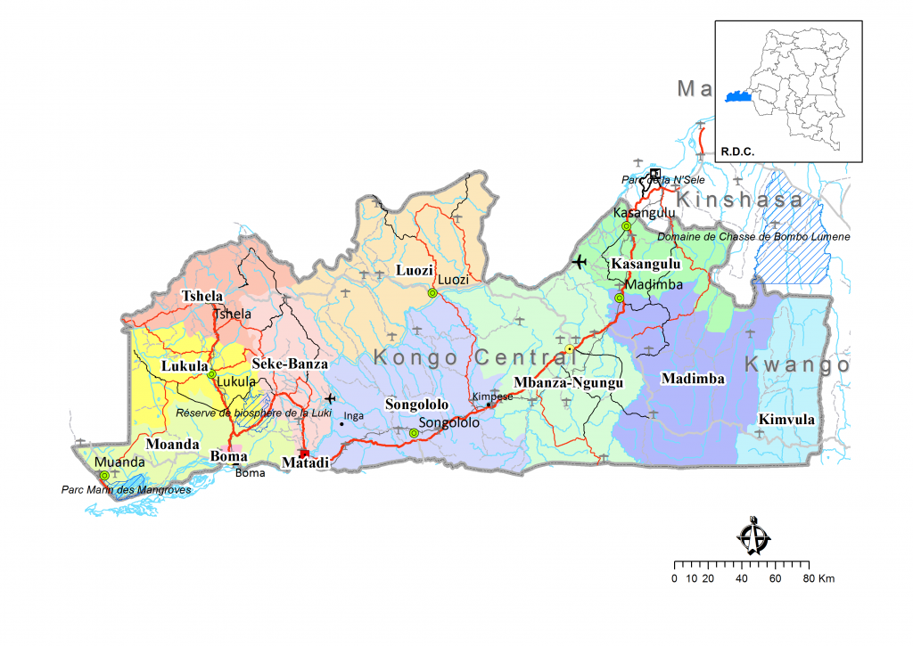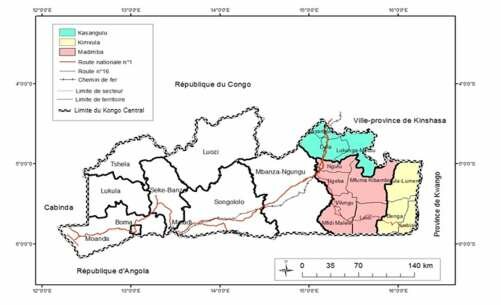 Kongo Central has an area of 53,855 km2 with an estimated population of nearly 6 million people, with a density of 108 inhabitants/km2. It has 10 territories, 2 towns, 6 communes and 34 districts, whose main activities are agriculture